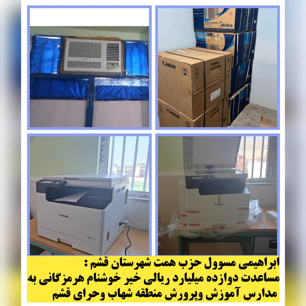 🔹به گزارش روابط عمومی حزب همت استان هرمزگان ؛با رایزنی مسوول این حزب در شهرستان قشم با خیر خوشنام هرمزگانی مبلغ دوازده میلیارد ریال معادل یک میلیارد ودویست میلیون تومان درراستای تهیه اقلام سرمایشی کولرودستگاه کپی در اختیار آموزش وپرورش منطقه شهاب قرار گرفت